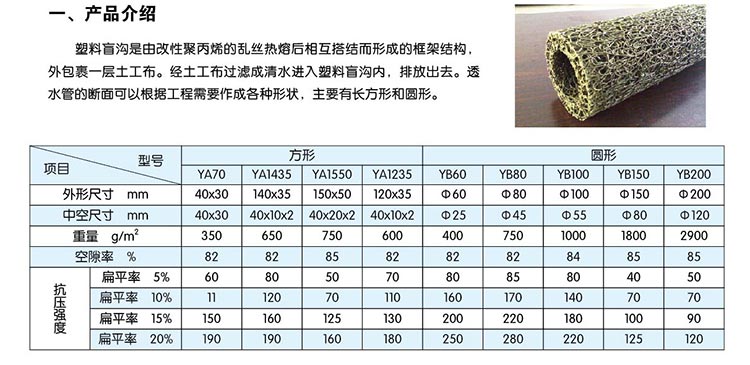 塑料盲溝是由塑料芯體外包裹濾布組式。塑料芯體是以熱可塑性合成樹(shù)脂為主要原料,經(jīng)過(guò)改性,在熱熔狀態(tài)下,通過(guò)噴咀擠壓出細(xì)的塑料絲條,再通過(guò)成型裝置將擠出的塑料絲在結(jié)點(diǎn)上熔接,形成三維立體網(wǎng)狀結(jié)構(gòu)。