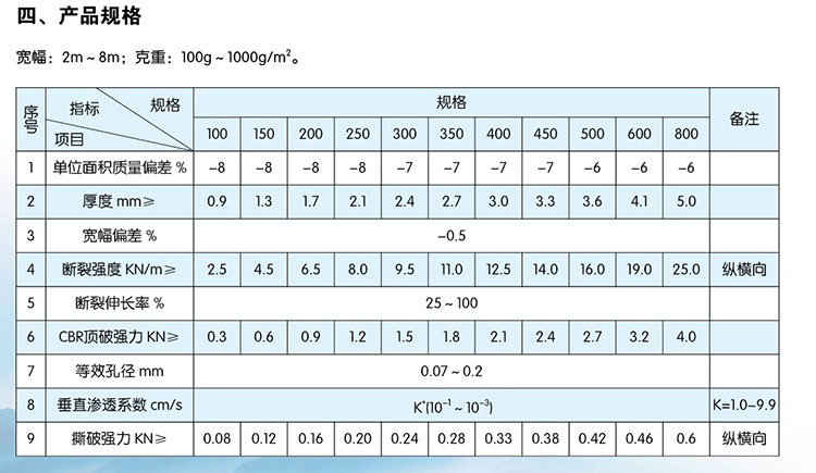 全稱: 短纖針刺土工布 規(guī)格參數(shù): 纖度為6-12旦,長度為54-64mm