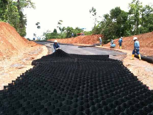 土工格室是由高強(qiáng)度的HDPE寬帶,經(jīng)過(guò)強(qiáng) 力焊接而形成的一片網(wǎng)狀格室結(jié)構(gòu)。它伸縮自如,運(yùn)輸時(shí)可縮疊起來(lái),使用時(shí)張開(kāi)并充填土石、或混凝土料,構(gòu)成具有強(qiáng)大側(cè)向限制和大剛度的結(jié)構(gòu)體。它可用來(lái)做為墊層,處理軟弱地基的承載能力,也可鋪設(shè)在坡面上構(gòu)成坡面防護(hù)結(jié)構(gòu),還可以用來(lái)建造支擋結(jié)構(gòu)等。施工方便快捷。